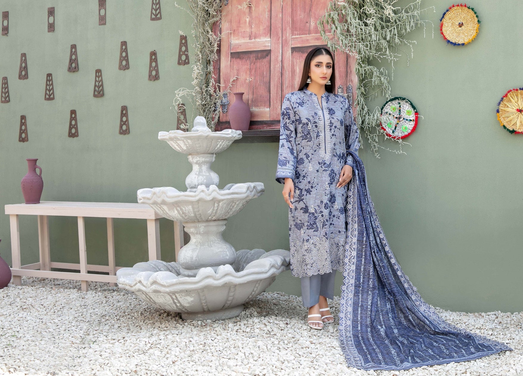 Cutwork Embroidered Digital Printed Lawn Dupatta & Un-Stitched Plain Cotton Shalwar Fabric