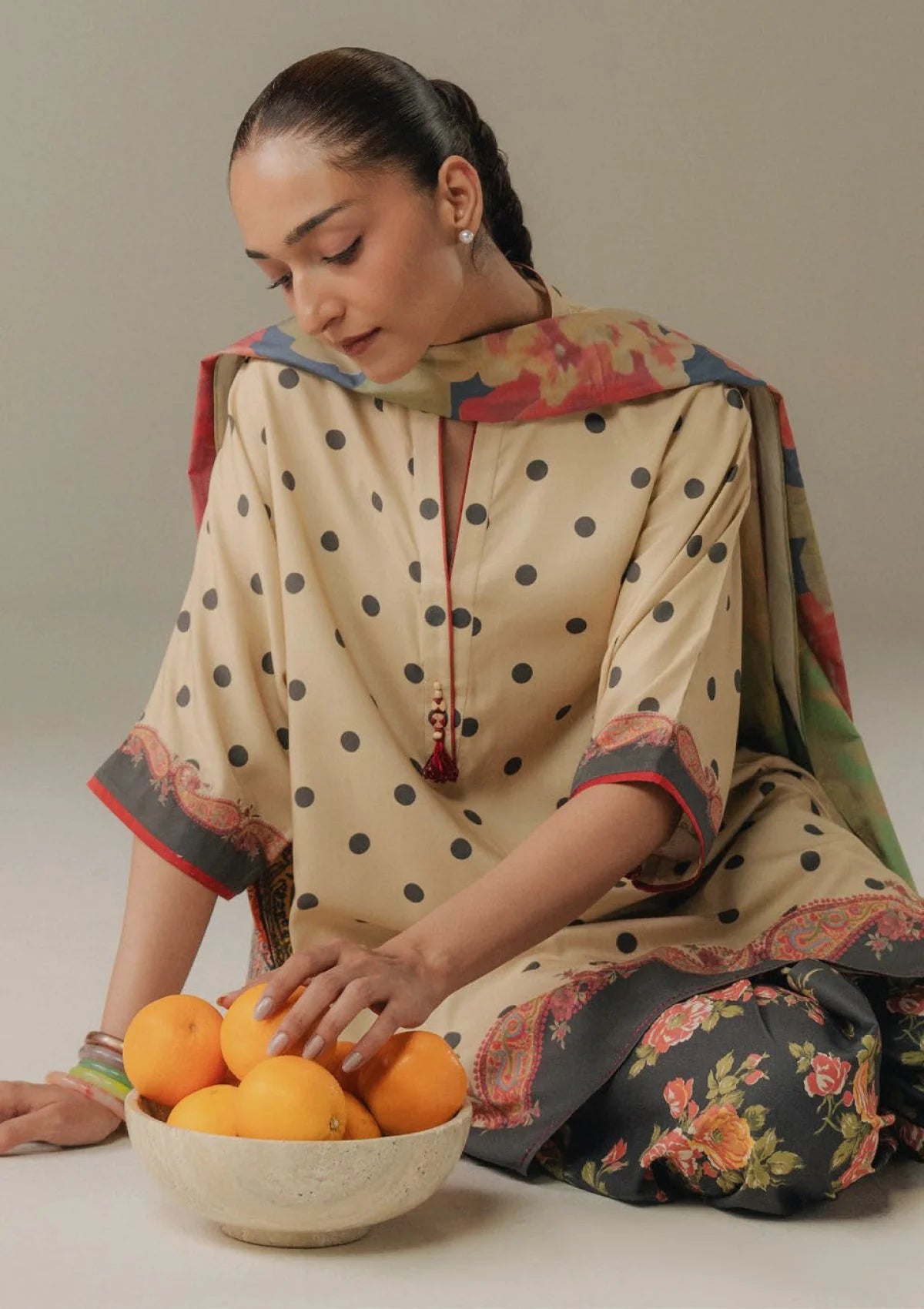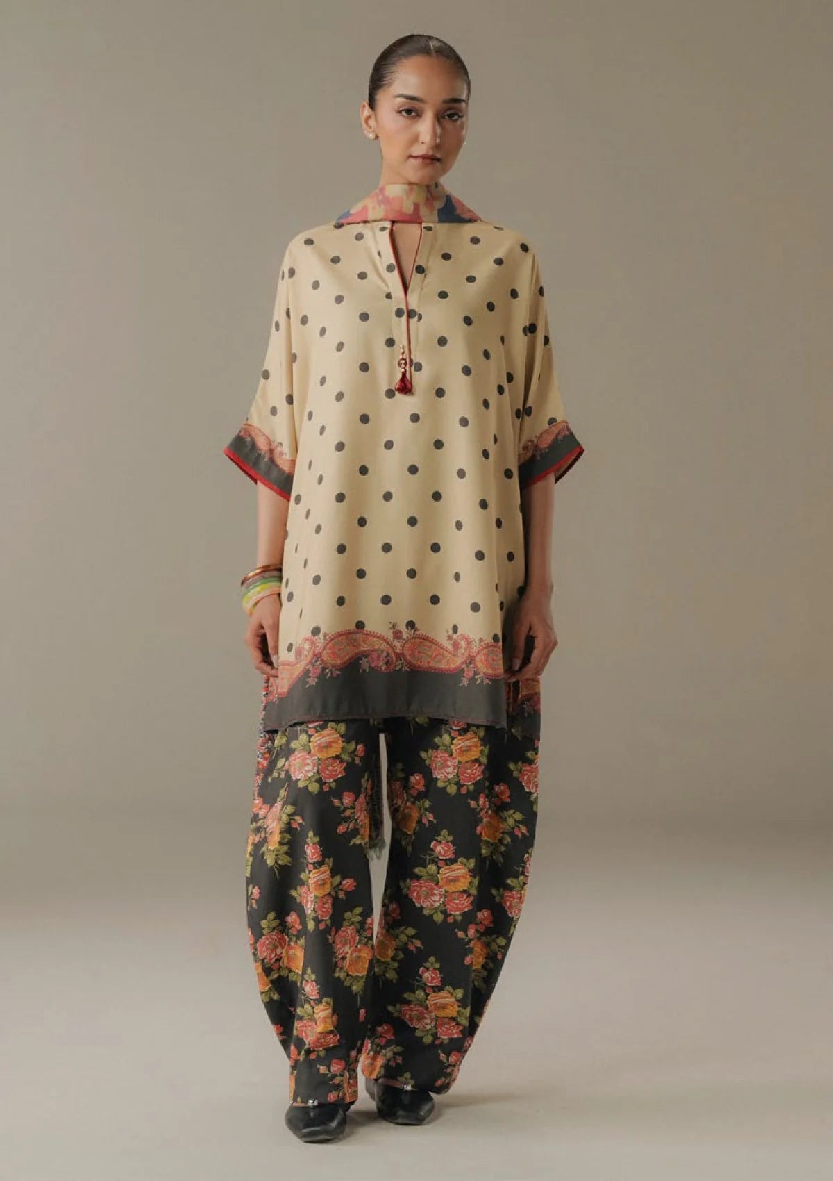 A tan rose striped shirt inspired by delicate floral motifs, paired with a tan rose trouser adorned with subtle paisley patterns. The look is completed with an off-white shawl featuring classic black polka dots, creating a timeless and effortlessly elegant ensemble.