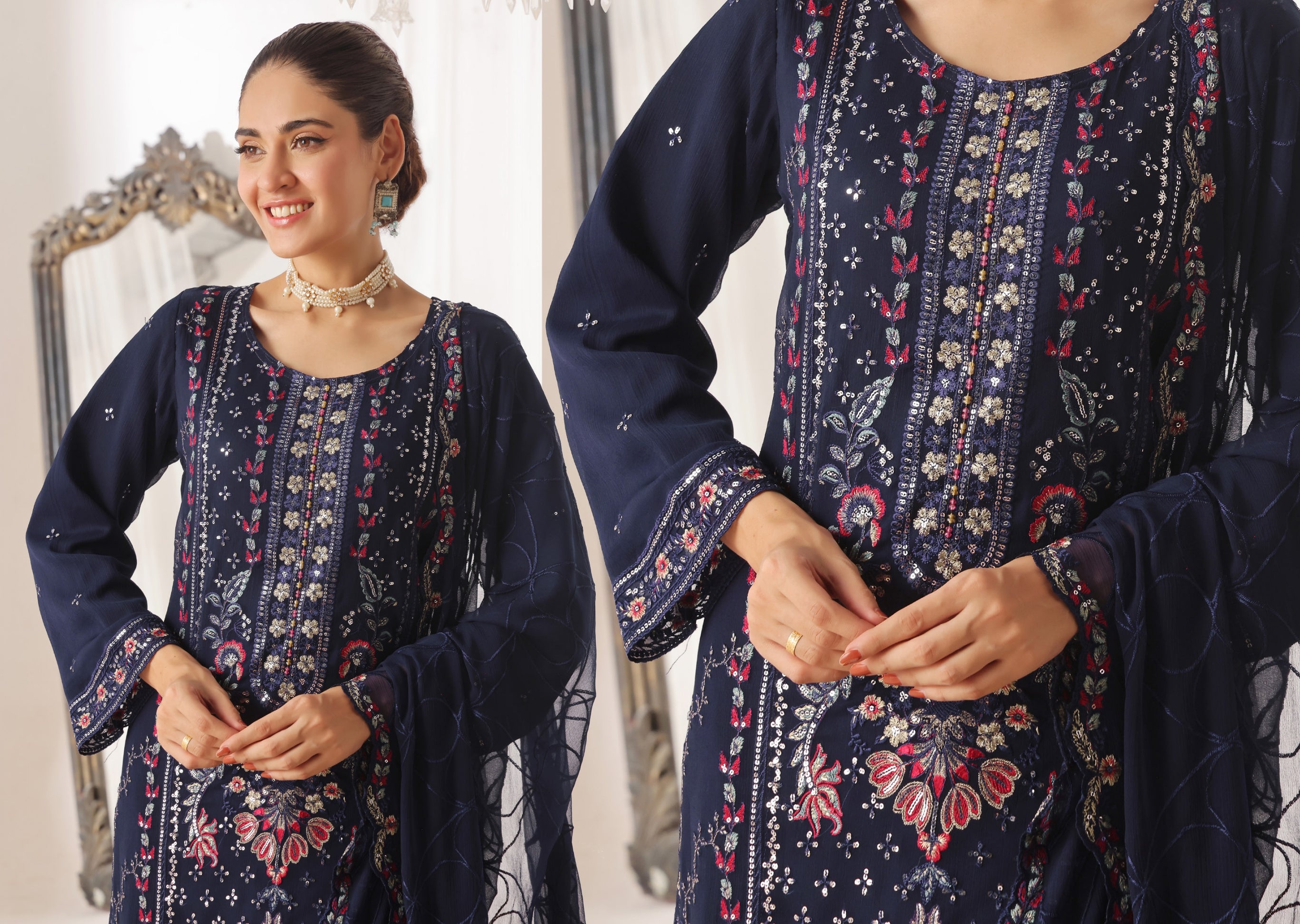 EMBROIDERED SEMI-STITCHED CHIFFON KAMEEZ/