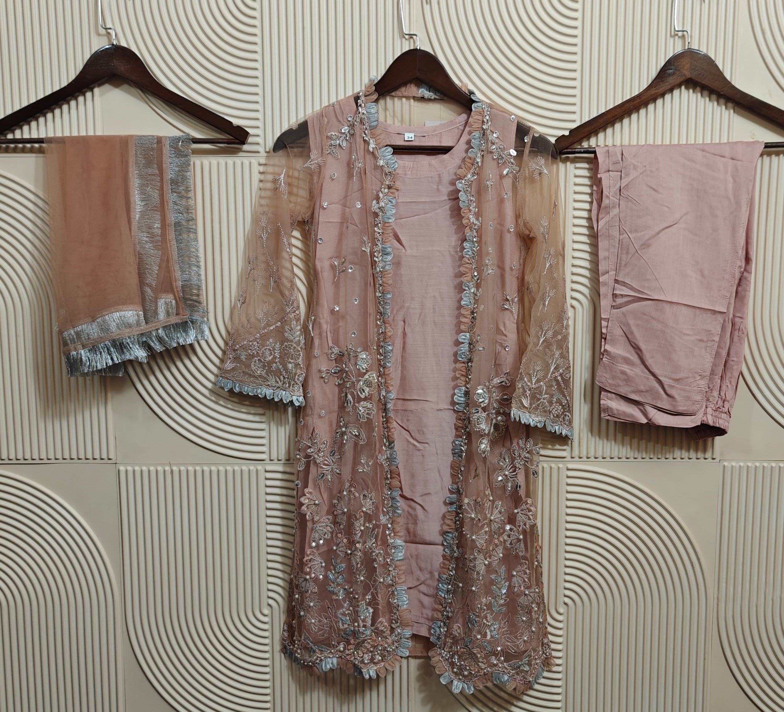Net embroidered open gown, adorned with meticulously handcrafted adda work