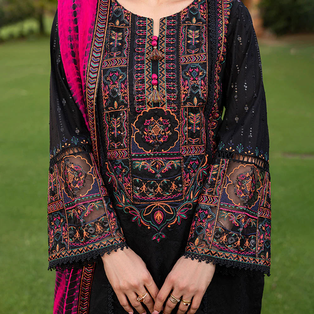 - BUTTON MID LENGTH SHIRT PAIRED WITH EMBROIDERED FARSHI SHALWAR & DYED SILK DUPATTA FINISED WITH EMB BORDER