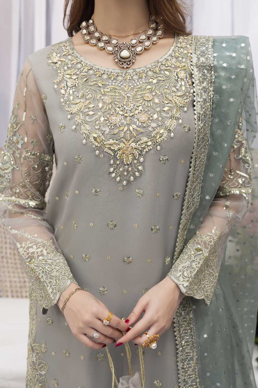 Top/ Shirt: Organza fabric, sequins & raisham embroidery, heavily hand-embellished neckline and front.