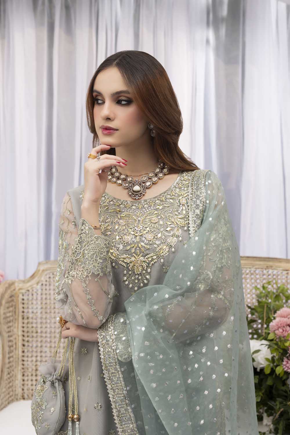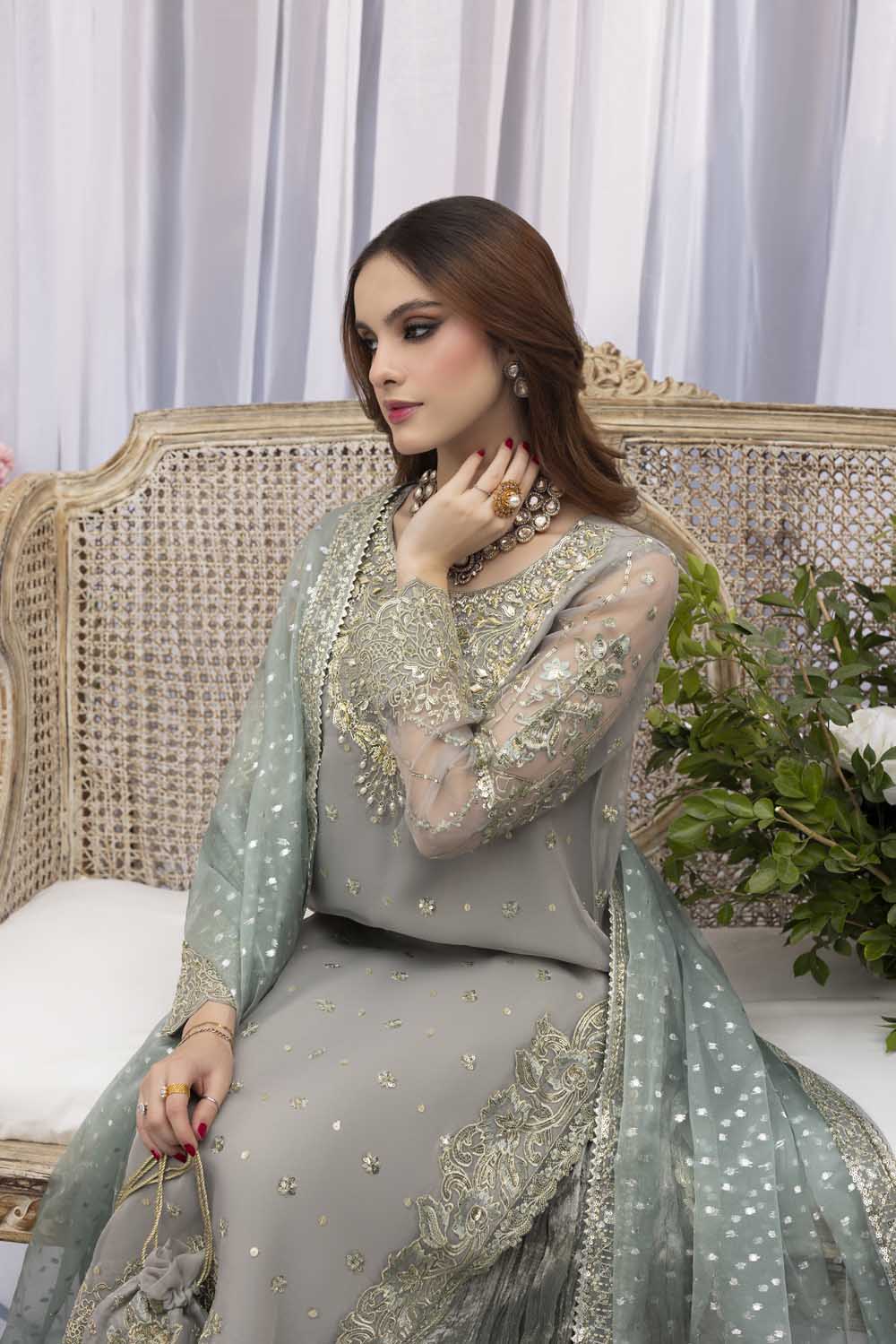 Dupatta: Zari organza, finished with heavy sequins & embroidery border.