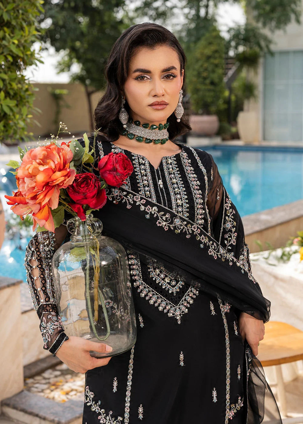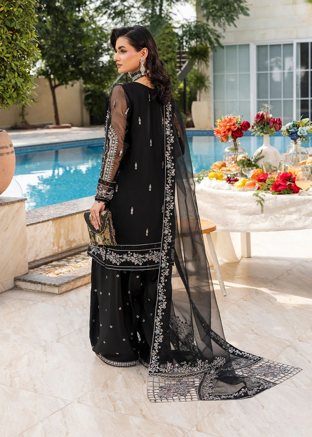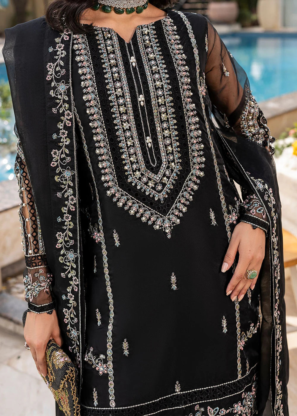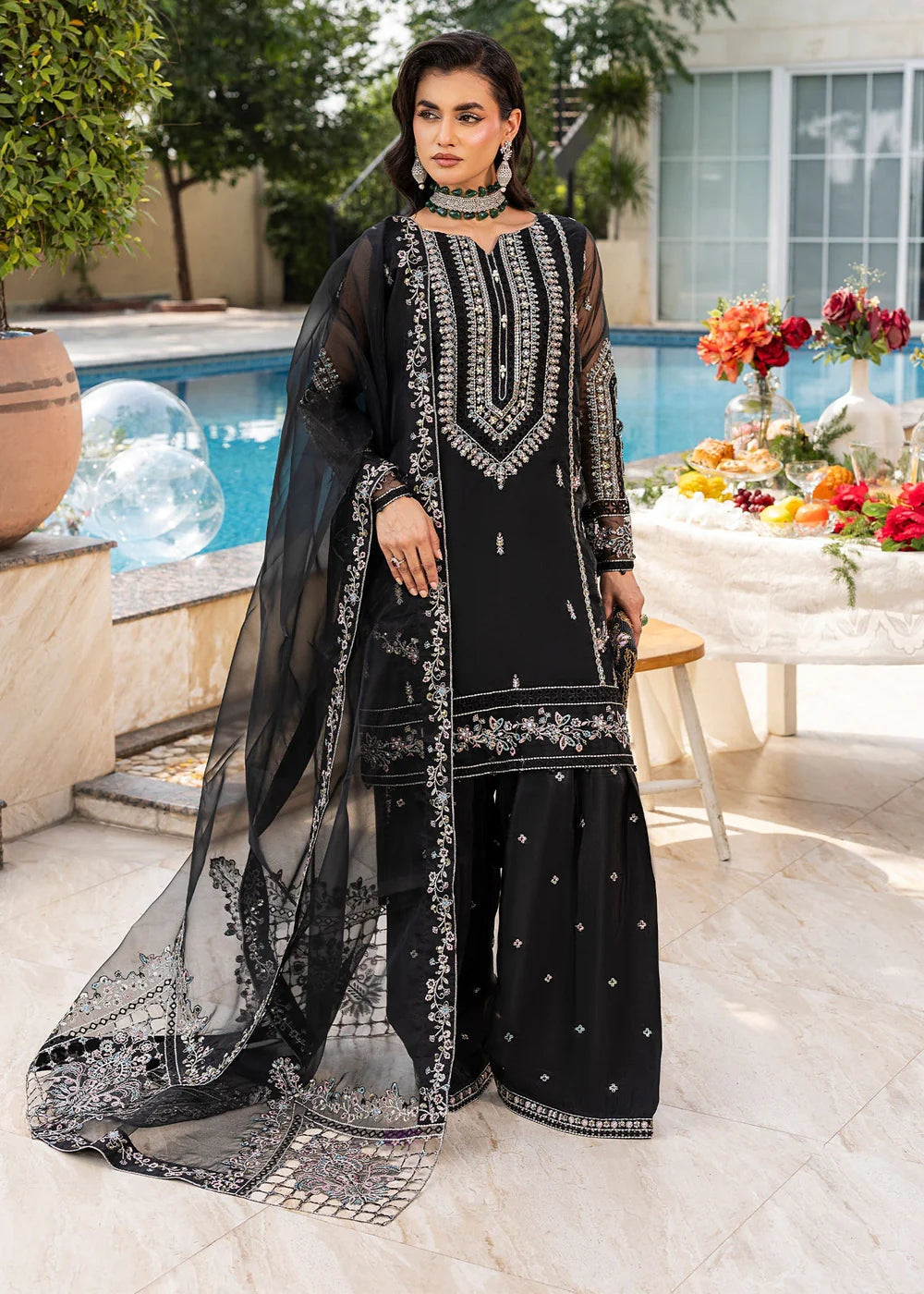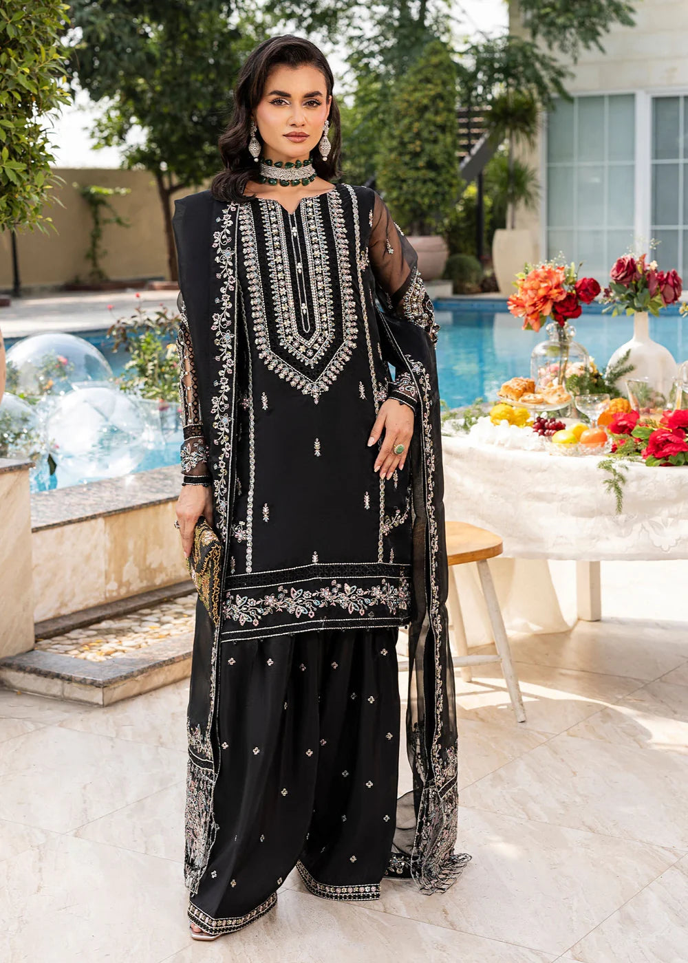 Short Length Shirt with Farshi Shalwar, paired with organza dupatta; this outfit competes the look with embroidery and light embellishment