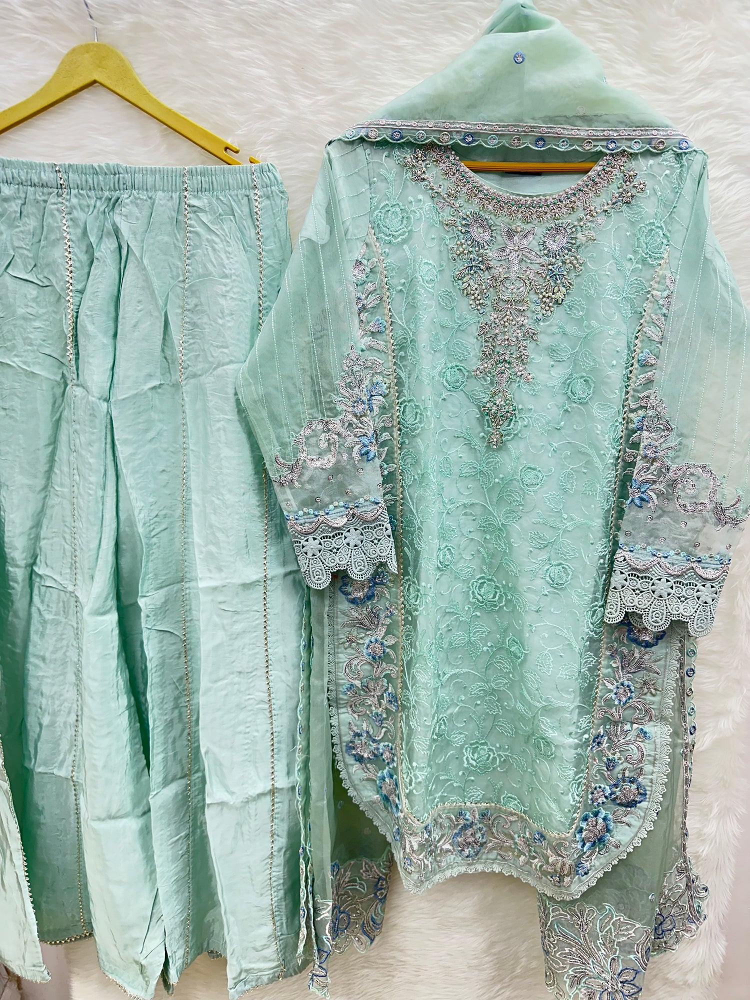- Organza embroiderd & hand Embelished shirt which is finished with composed Daman Nd hem border.