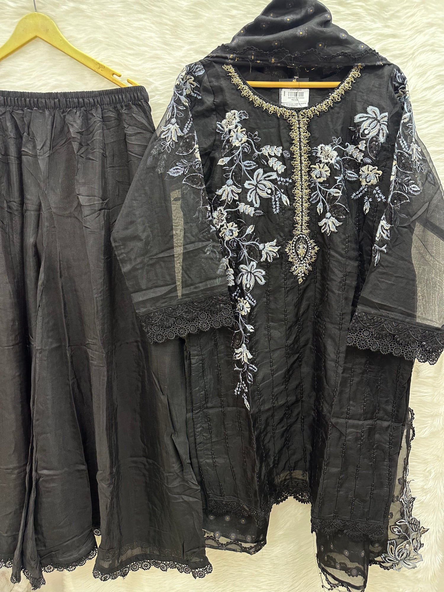 - Organza embroidered sleeves finished with embroidered border & Lace