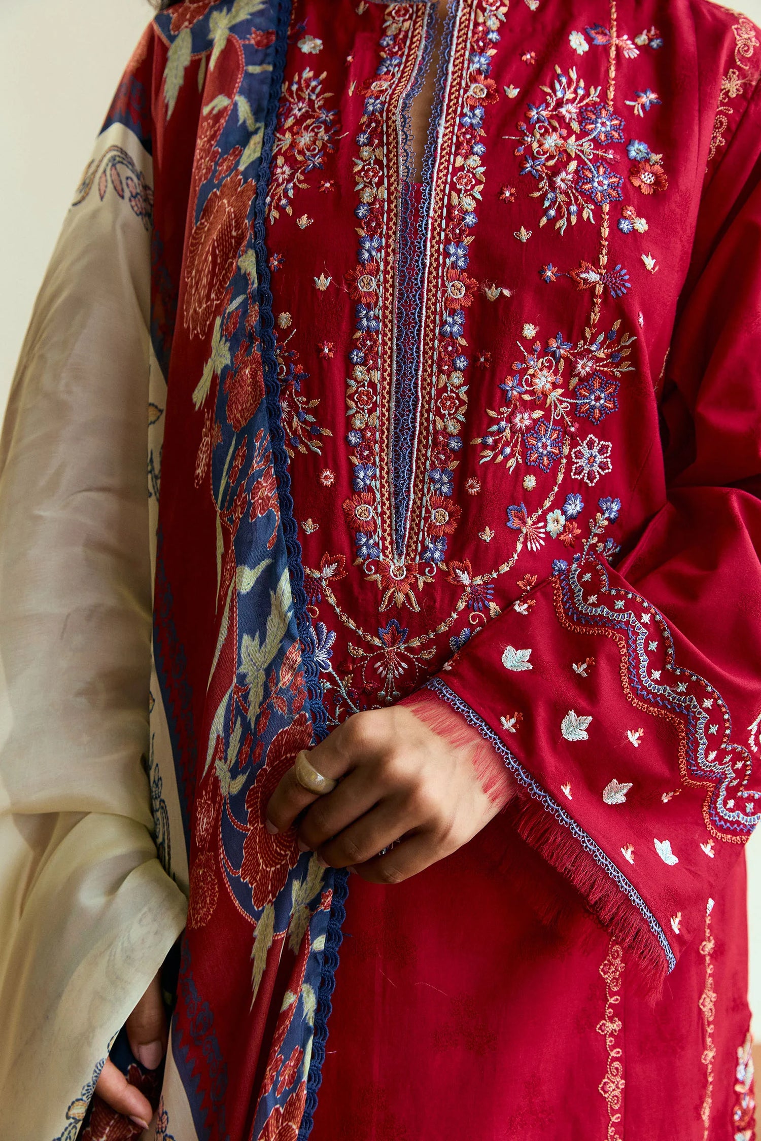 A bold crimson light jacquard set with folk embroidery, paired with a classic ivory silk dupatta—striking yet timeless, with a nod to tradition.