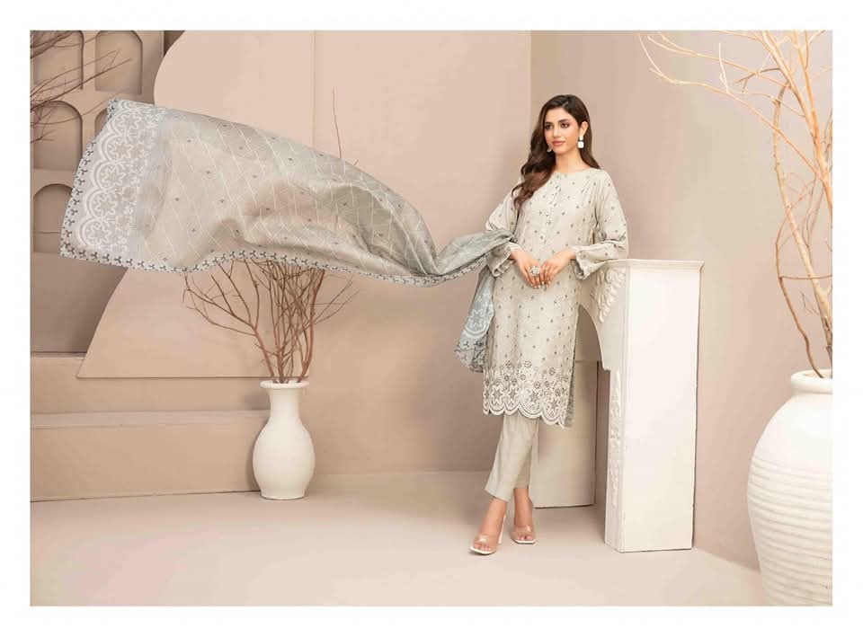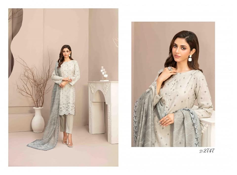 3 Piece Stitched Collection By Tawakkal Fabrics, Attractive & Elegant Embroidered Broshia Banarsi Lawn Collection comes with: