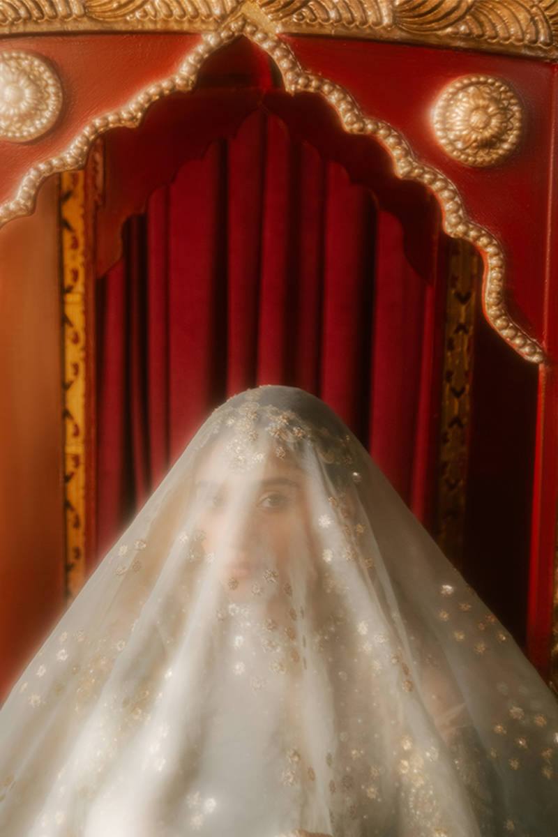 Embrace the ethereal beauty of "Shabnami" from MNR’s Dur-e-Nayab 2024 unstitched collection. This soft, light beige pishwas in organza features intricate thread and tilla embroidery, sequin accents, and delicate hand-applied pearls. The striking hem border, adorned with large floral-geometric motifs, adds a graceful flourish to the silhouette. Paired with an Indian silk lehenga with an embroidered border, and a serene blue organza dupatta with a four-sided border and subtle motif spray, "Shabnami" captures the essence of delicate beauty, combining understated elegance with captivating craftsmanship.