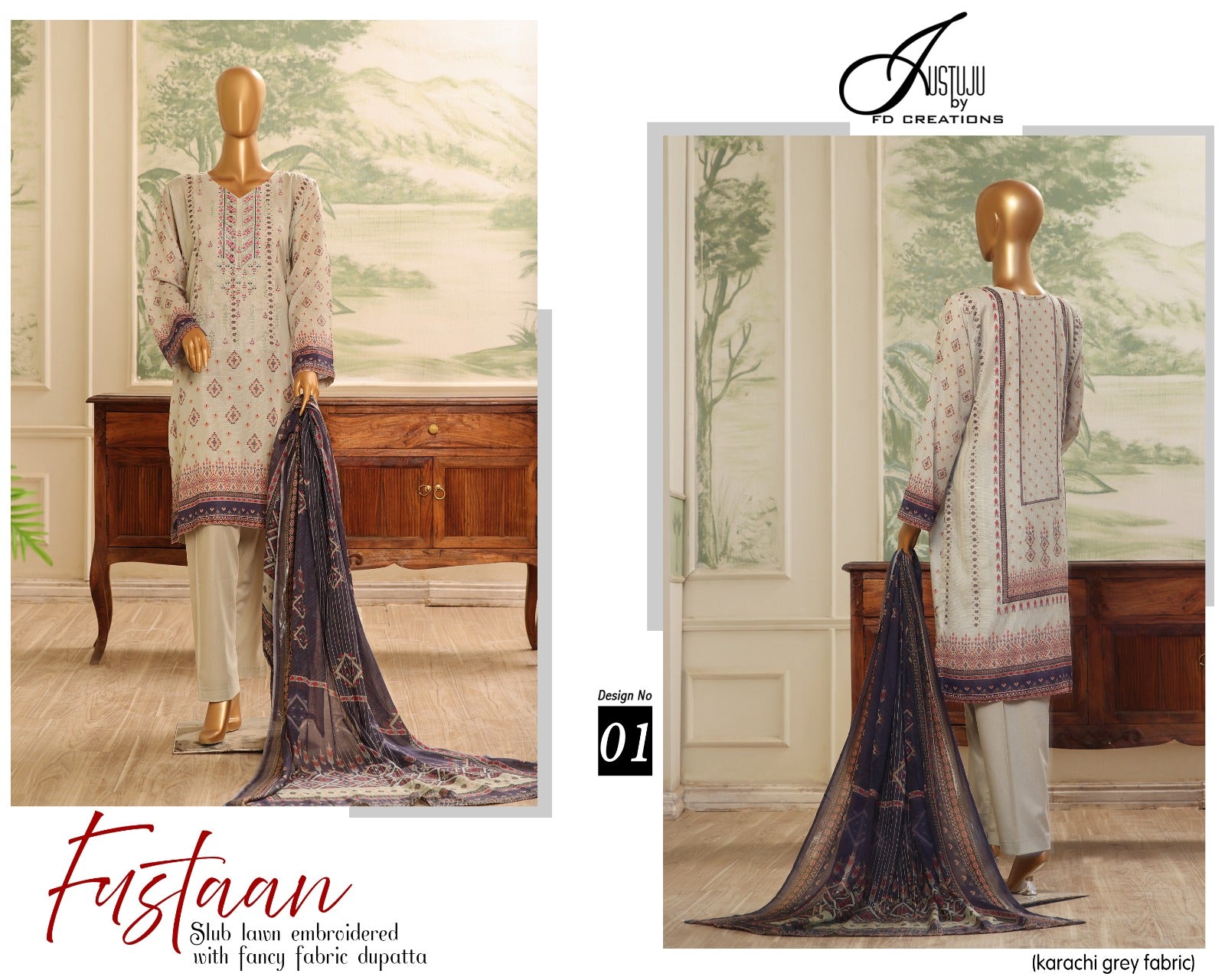 FUSTAAN BY JUSTJU UN-STITCHED LAWN-DESING NO-01