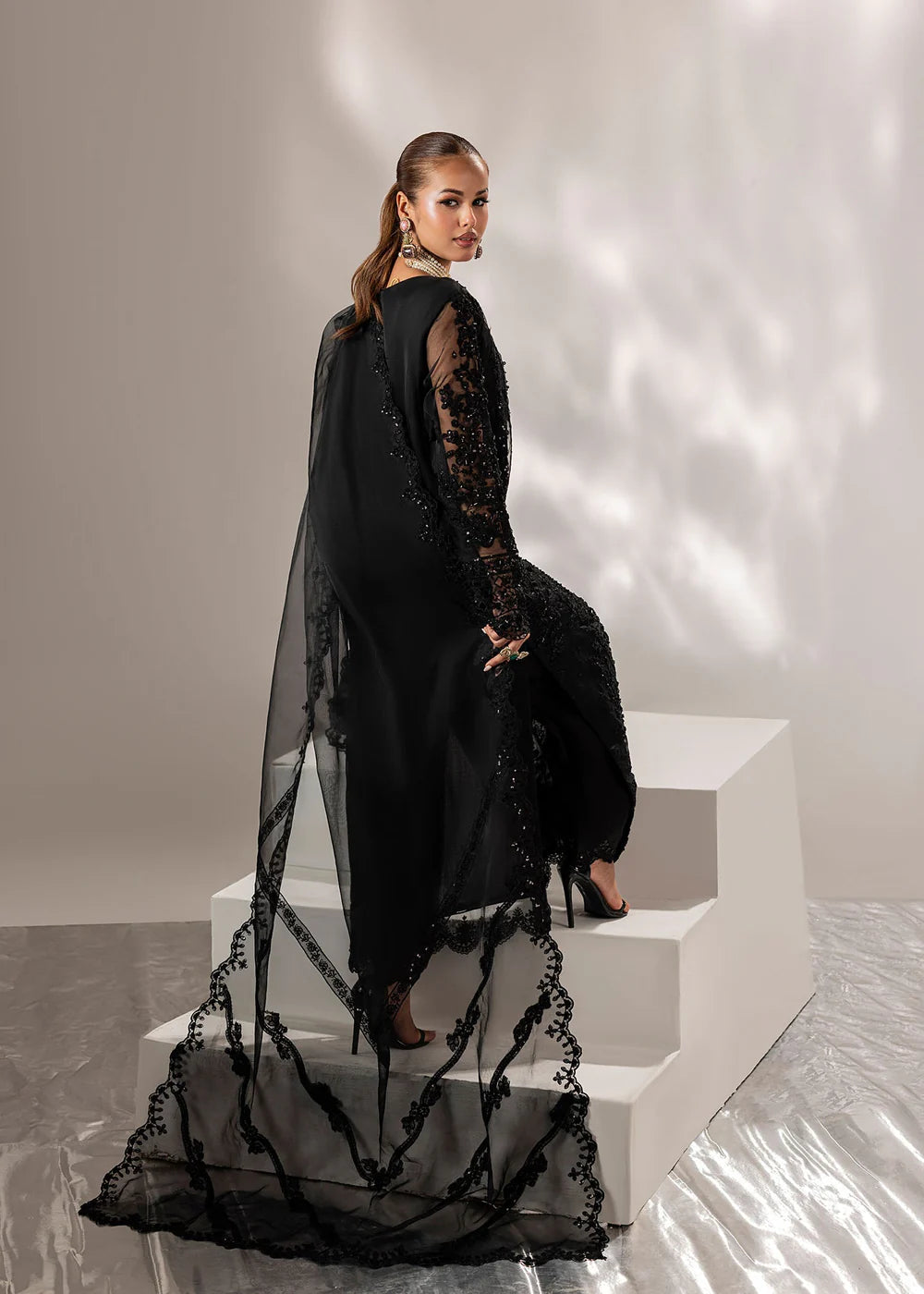 Long length shirt with straight trouser, paired with organza dupatta; this outfit competes the look with embroidery and heavy embellishment.