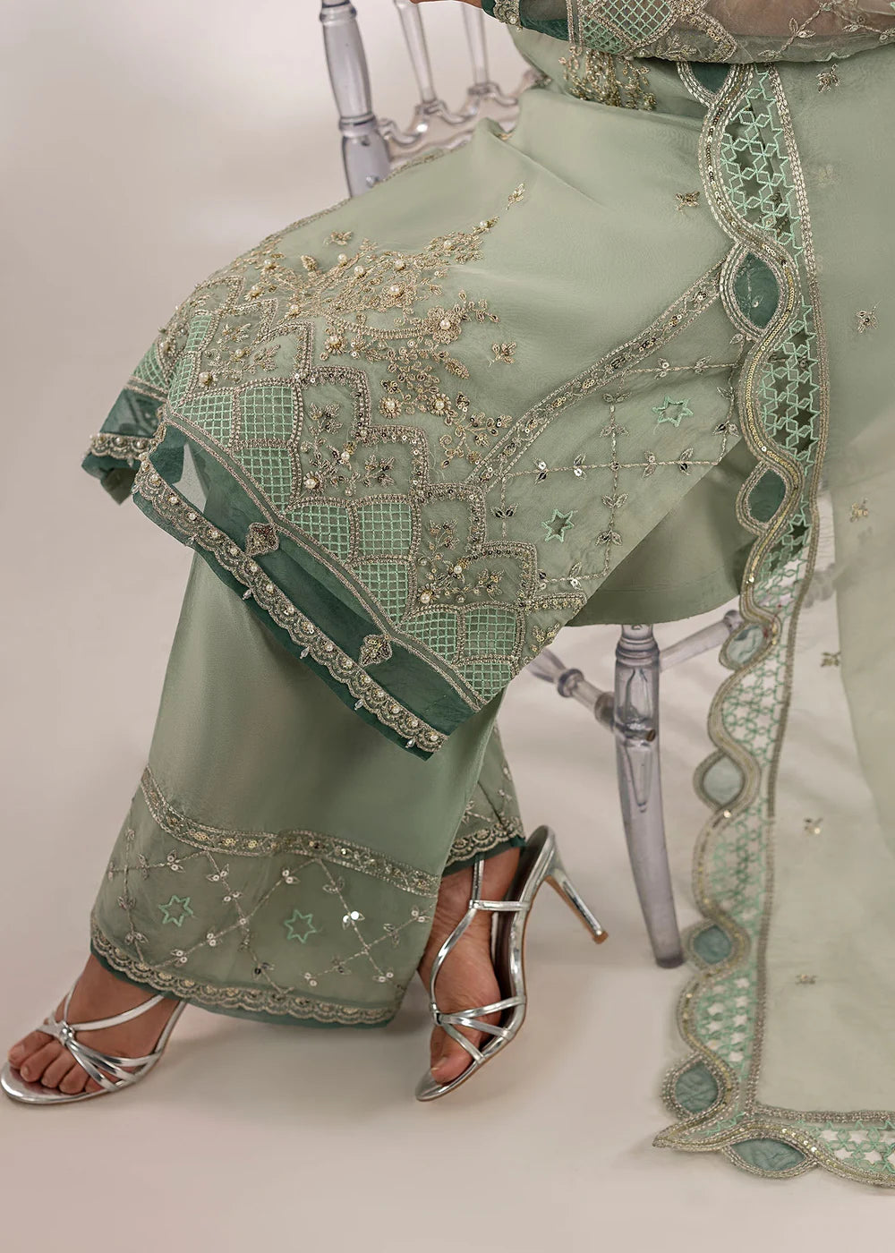 Medium length shirt with straight trouser, paired with organza dupatta; this outfit competes the look with embroidery and light embellishment.