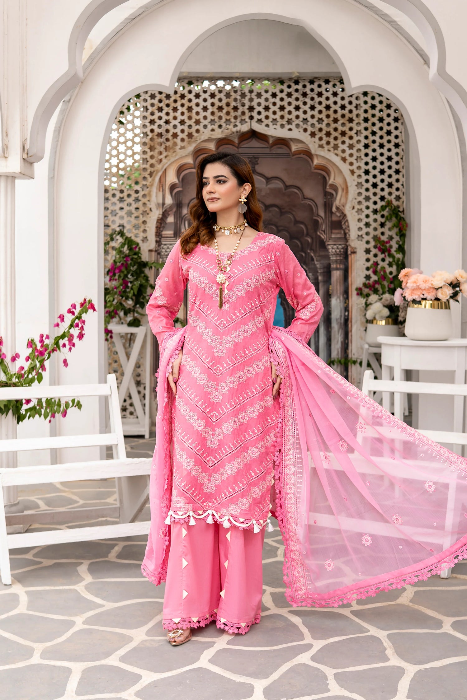 Gulbahar showcases timeless elegance crafted from premium fabrics with intricate embroidery and detailed patterns. The soft pink palette exudes charm, while the refined neckline, sleeves, and chiffon dupatta elevate its luxurious appeal. Designed for festive occasions and special gatherings, this ensemble harmonizes traditional craftsmanship with contemporary style. The package includes embroidered lawn fabric for the front, back, sleeves, and a 2.5-meter chiffon dupatta, providing everything needed to create a graceful, standout outfit.