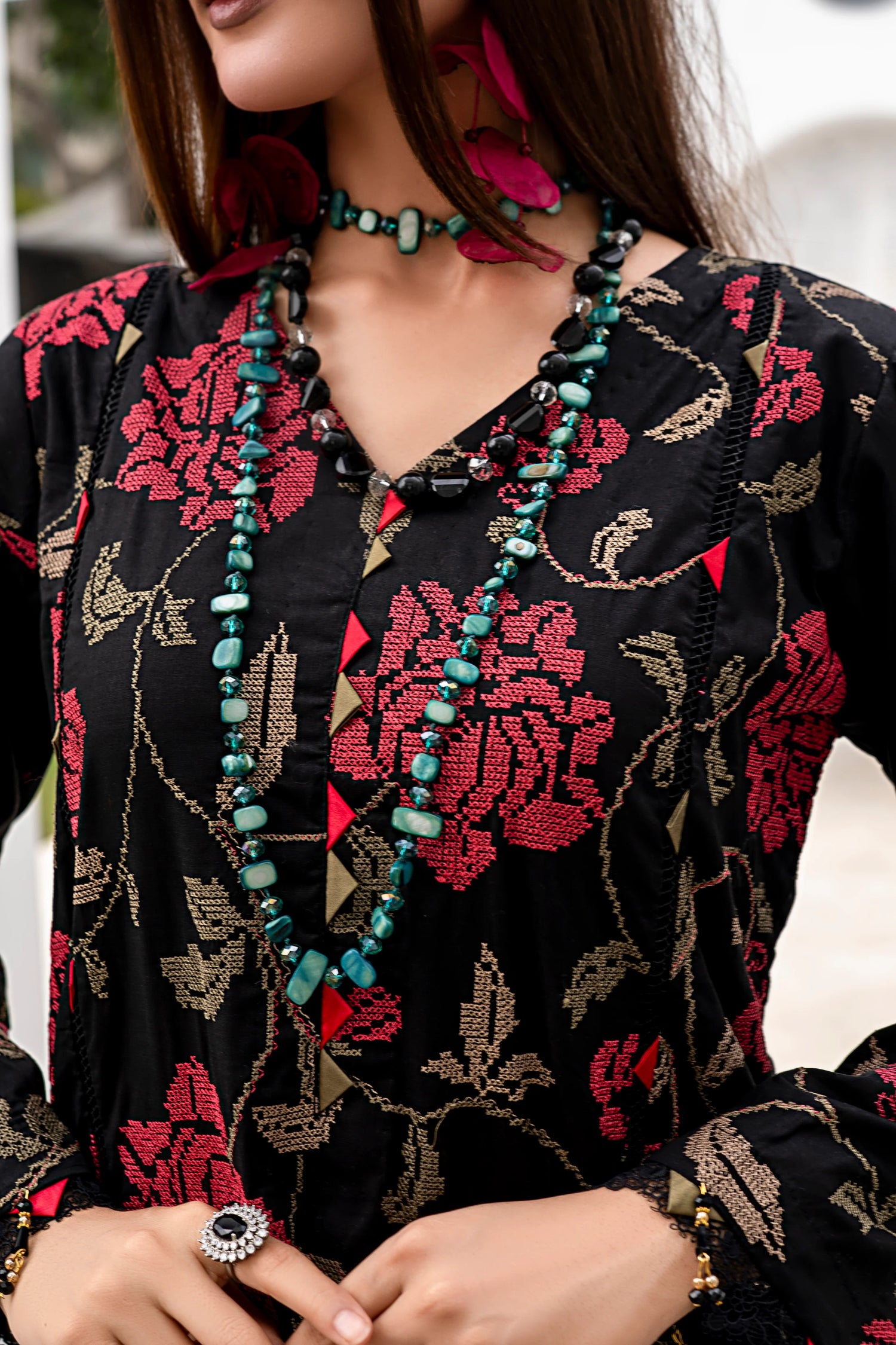 Discover elegance with the Shama-e-Gul from the Kiran Cambric Collection. Crafted in deep black lawn fabric, this outfit features bold red and fine gold floral embroidery on the front, back, and sleeves, showcasing refined craftsmanship. The flowy silhouette, paired with a 2.5-meter chiffon embroidered dupatta, offers graceful draping for a sophisticated appearance. Completing the set is a dyed cotton trouser fabric, ensuring comfort and style. Ideal for those seeking timeless sophistication with a modern touch.