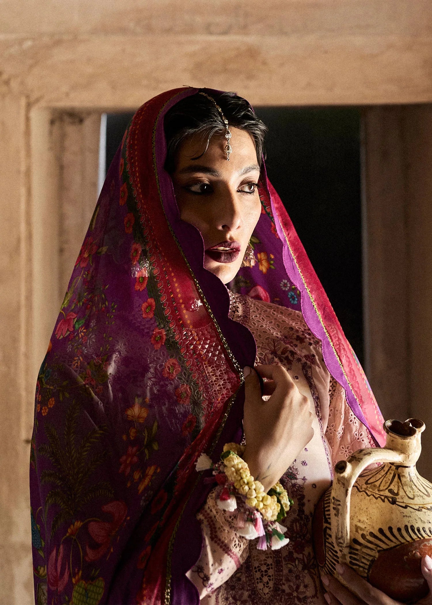 A peachy pink ensemble crafts a picturesque view of trendy modernity, infused with skillfully executed embroidery on the finest lawn fabric. Modern and diverse embroidery stitches enhance the design. Alluring modern elements are combined with intricate embroidery in hues of ivory, pinks, and purple, creating an ethereal aesthetic. Lace detailing on the neck and sleeves provides a cutwork effect. A printed dupatta, paired with matching printed cotton trousers, completes this dazzling and contemporary silhouette.
