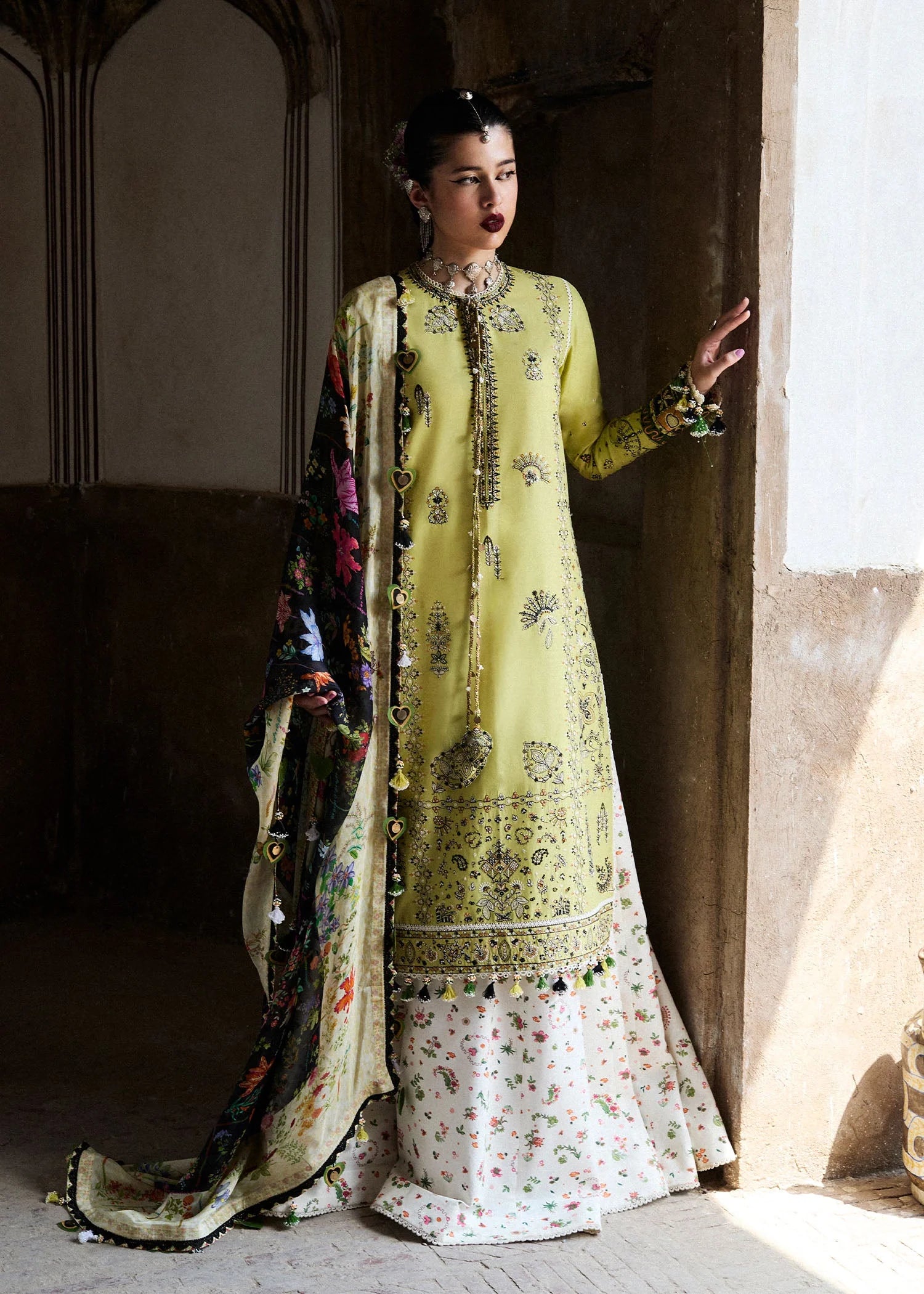 An apple green ensemble crafts a picturesque view, blending rich modern aesthetics with classic elegance, enhanced by skillfully executed embroidery on the finest lawn fabric. Alluring modern elements, combined with intricate embroidery in black, ivory, and orange hues, lend an ethereal quality to the design. A digital silk printed dupatta, paired with printed cotton trousers, completes this dazzling modern silhouette.