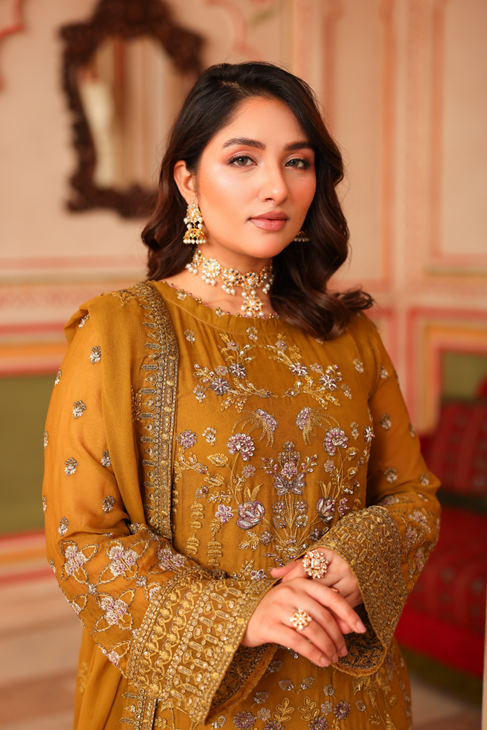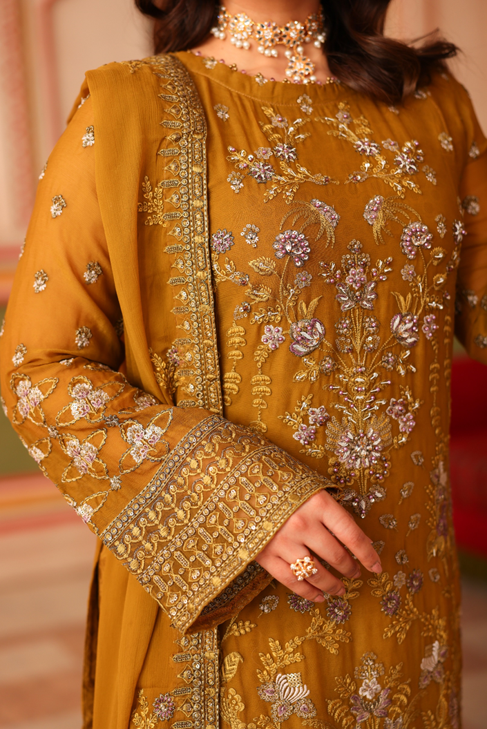 An elegantly draped dupatta with four-sided grip borders and an organza border along each pallu. It features a delicate golden sequin pattern with embroidered tilla and thread detailing that complements the overall ensemble.