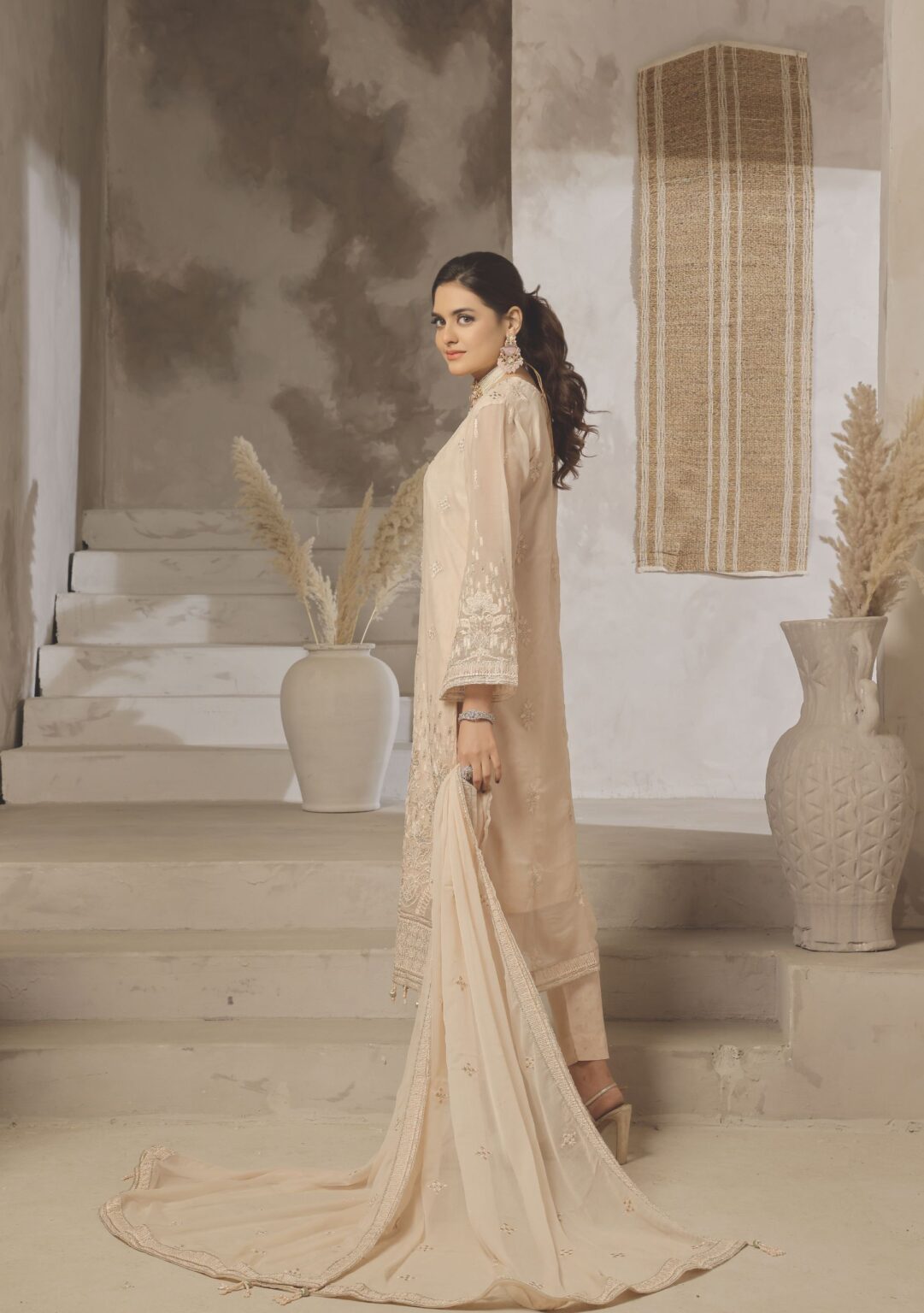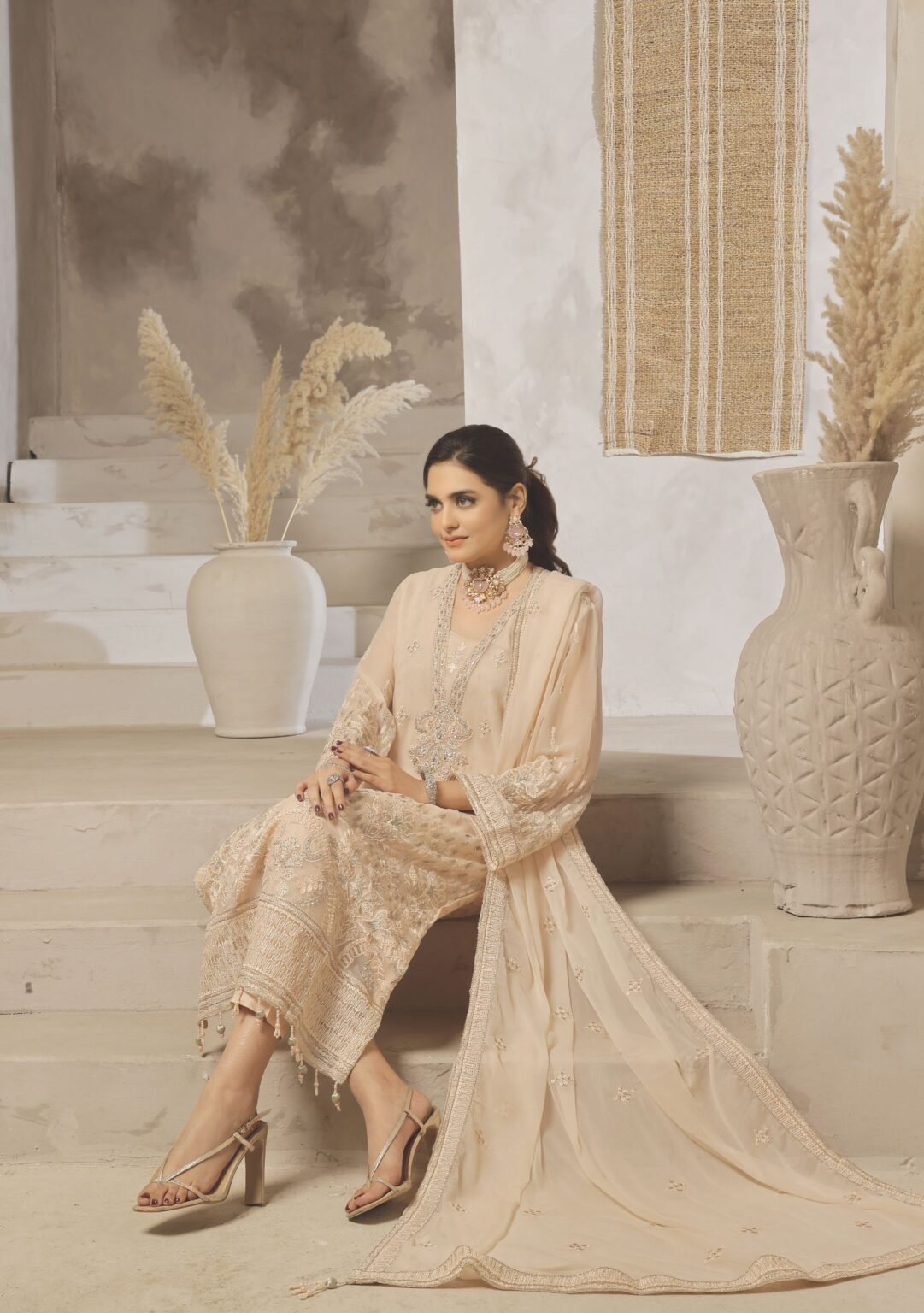 An elegantly draped dupatta with four-sided grip borders and an organza border along each pallu. It features a delicate golden sequin pattern with embroidered tilla and thread detailing that complements the overall ensemble.