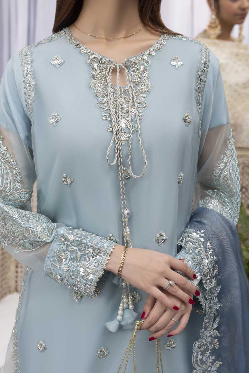 Neckline: Hand-embellished neckline, finished with elegant dori tassels.