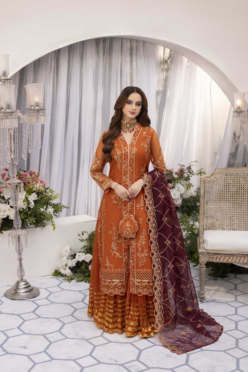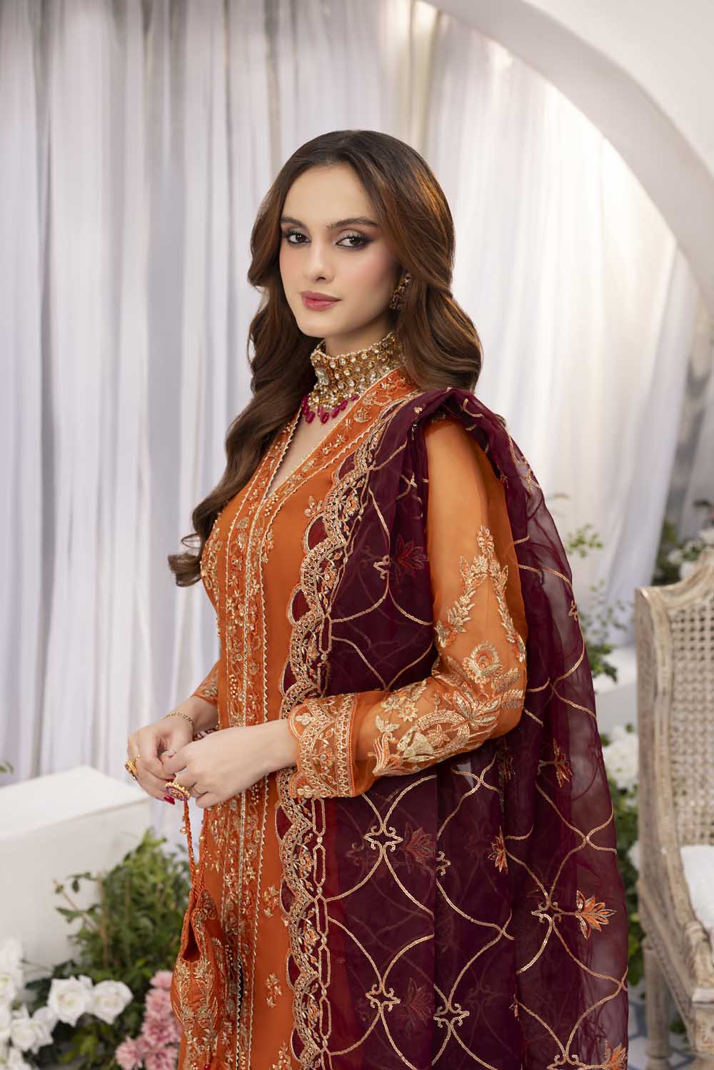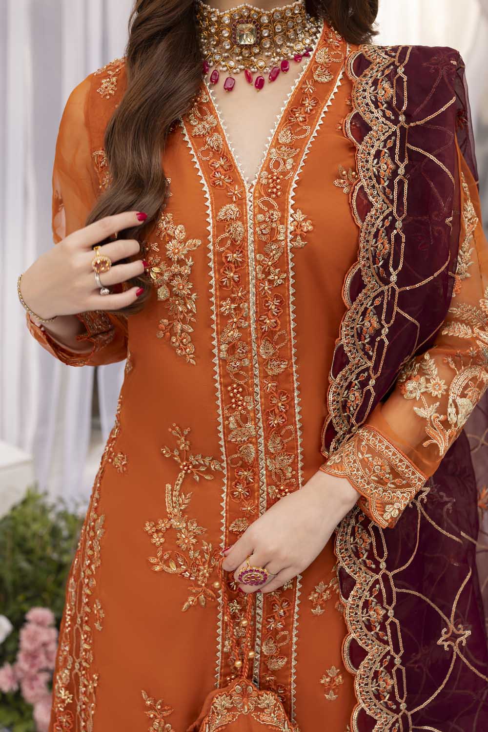 - Dupatta: Heavy embroidered organza dupatta, finished with rich sequins and embroidered borders.