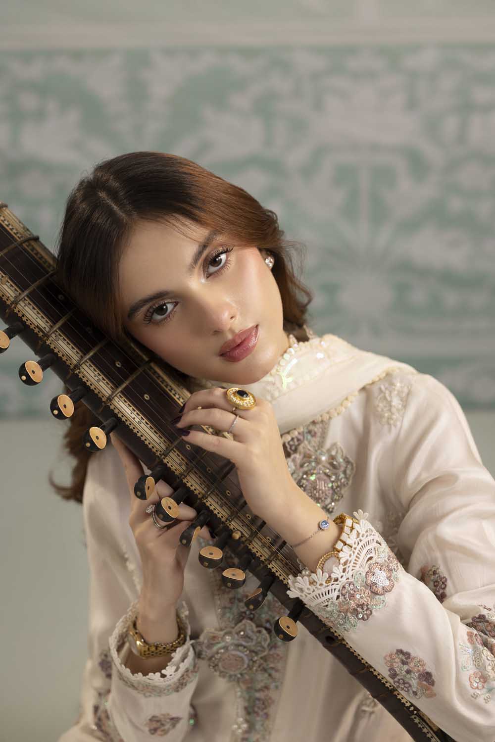 Trousers: Paired with elegant embroidered trousers.