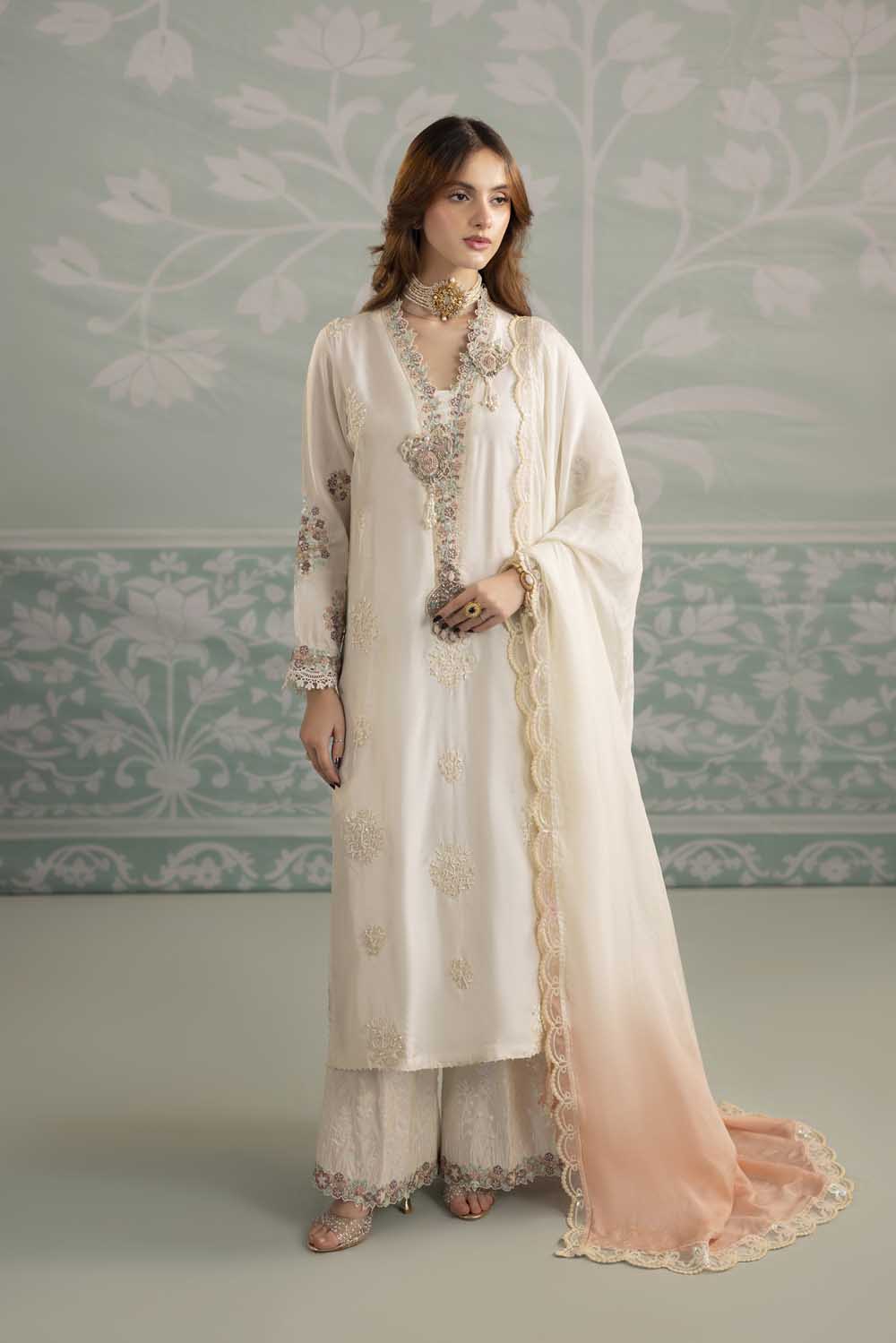 Dupatta: Silk ombré dyed dupatta, adorned with an embroidered border.